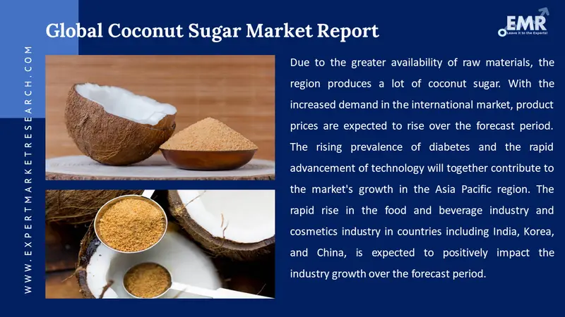 Asia Pacific is expected to be one of the largest producers of coconut sugar owing to abundant raw material availability and a rise in disposable income. Due to the greater availability of raw materials, the region produces a lot of coconut sugar. With the increased demand in the international market, product prices are expected to rise over the forecast period. The rising prevalence of diabetes and the rapid advancement of technology will together contribute to the market's growth in the Asia Pacific region. The rapid rise in the food and beverage industry and cosmetics industry in countries including India, Korea, and China, is expected to positively impact the industry growth over the forecast period.