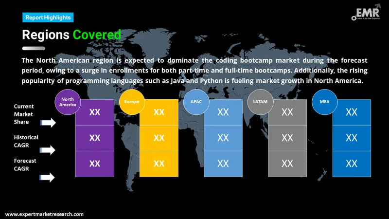 North America is anticipated to hold a sizable coding bootcamp market share over the forecast period, this is due to increasing enrolments in both part time and full time bootcamps. Growing popularity of programming languages including Java and Python, among others, is further driving the growth of the market in the North America region. The well-established IT infrastructure, presence of numerous companies that require coding skills, and robust opportunities for entrepreneurs are supporting the North America market growth for coding bootcamps. Rising investments in coding for providing better user experience is further aiding the growth of the market by increasing the demand for capable coders. These factors are anticipated to boost the coding bootcamp market revenue across North America over the forecast period.