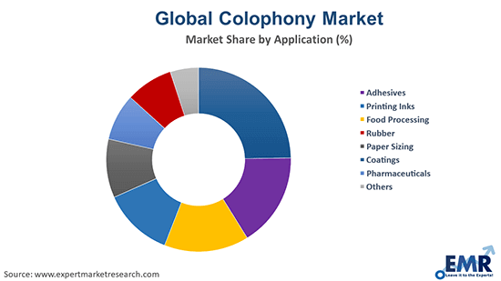 Adhesives, printing inks, food processing, rubber, paper sizing, coating, and pharmaceuticals, among others, are the major applications of colophony.