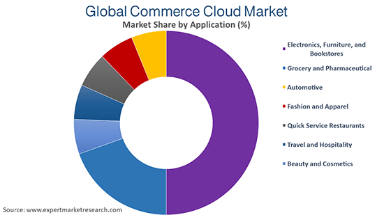 Electronics, furniture, and bookstores, grocery and pharmaceutical, automotive, fashion and apparel, quick service restaurants, travel and hospitality, and beauty and cosmetics are the various applications of commerce cloud.