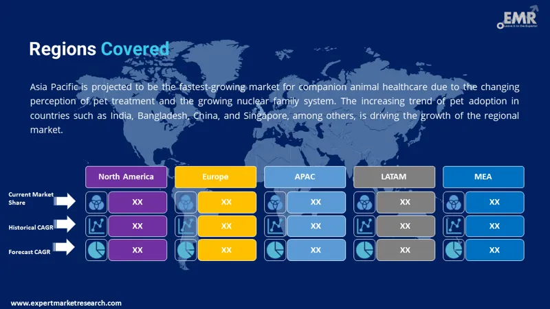 Asia Pacific is expected to be the fastest-growing companion animal healthcare market due to the region's changing perception of pet treatment and the growing nuclear family system. The growth of the regional market can be attributed to the increasing trend of pet adoption in countries such as India, Bangladesh, China, and Singapore, among others. India is one of the most lucrative markets for developing the market. The government is also putting a lot of effort into creating the veterinary healthcare infrastructure, thus presenting several lucrative business opportunities for developing the local market. The Australian and Japanese markets are more aware of pet products and have quality-conscious pet owners, propelling the regional market growth.
