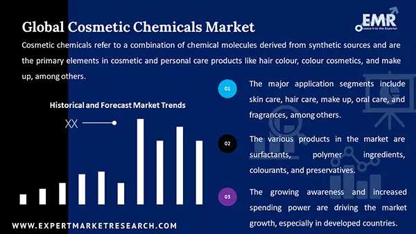 The global market for cosmetic chemicals is growing owing to the increased demand for beauty products by the growing population of working women. The growing awareness and increased spending power are driving the market growth, especially in developed countries. In line with this, consumers are becoming increasingly conscious of the products they use and there is a surging demand for mild, natural, and non-animal-based products. This trend has led to the manufacturers growing interest in environmentally friendly products, thereby positively impacting the growth of the market.