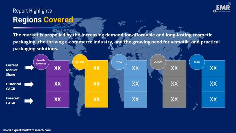 The Asia Pacific cosmetic packaging market is witnessing rapid growth due to rising consumer demand for beauty products. The expanding middle-class population, urbanisation, and growing beauty consciousness are driving the market. Additionally, the increasing use of eco-friendly and sustainable packaging solutions in countries like India and Japan is further bolstering the market growth in the region.