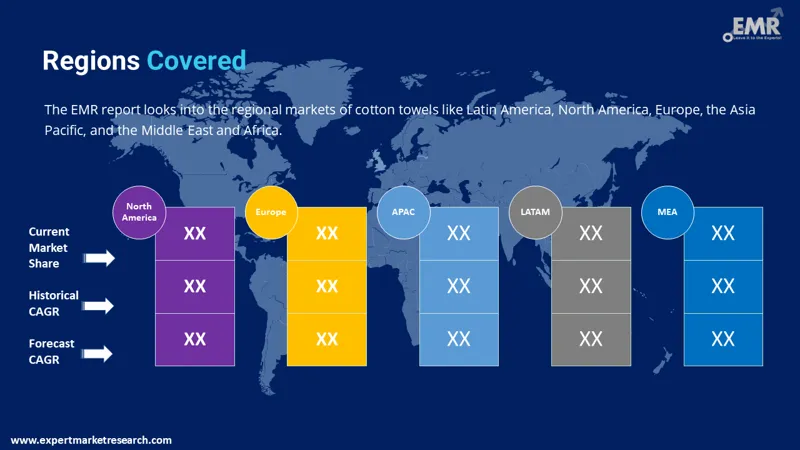 The major regional markets for cotton towels are North America, Europe, the Asia Pacific, Latin America, and the Middle East and Africa.