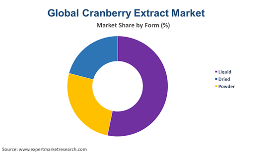 The Asia Pacific also holds a prominent cranberry extract market share, driven by rising consumer health consciousness. In the region, the penetration rates of cranberry products in bakeries and convenience stores have risen rapidly, climbing to 50% and 29%, respectively. China, India, and South Korea are among the major producers. With the growing popularity of healthier snacks, drinks, and dietary supplement options that contain cranberries, food manufacturers such as Del Monte Foods and Dabur Ltd. are capitalising on this trend.