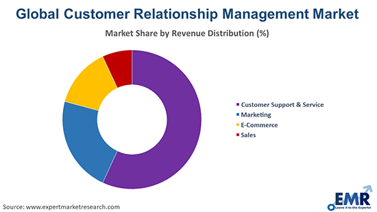 By revenue distribution, the market is divided into customer support and service, marketing, e-commerce, and sales.