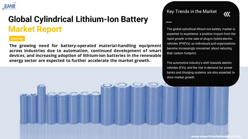 Rapid growth in the sale of plug-in hybrid electric vehicles (PHEVs) due to rising concerns about keeping a check on carbon footprint is anticipated to impact the global cylindrical lithium-ion battery market positively. The growing shift in the automotive industry to EVs and an increase in demand for power banks and charging systems are anticipated to propel the marke4t growth. Also, the rise in demand for consumer electronics across the globe is one of the major factors augmenting the growth of the global market. The penetration of portable variants, such as laptops, gaming consoles, smartphones, torches, and digital cameras, along with high-speed internet connectivity, is significantly impacting the market. In addition, the growing need for battery-operated material-handling equipment in industries due to automation, continued development of smart devices, and growing adoption of lithium-ion batteries in the renewable energy sector is also accelerating the global market growth.