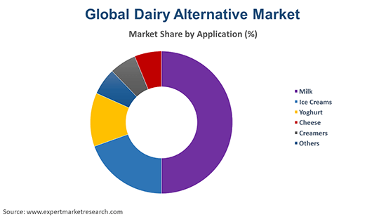 The different applications of dairy alternatives in the market are milk, ice creams, yoghurt, cheese, and creamers, among others.