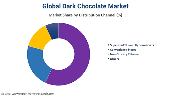 Supermarkets and hypermarkets are expected to account for a significant share of the dark chocolate industry. Such stores allow consumers to choose from an array of brands, ranging from affordable to premium ones. With the growing interest in healthy eating, supermarkets and hypermarkets are increasingly stocking dark chocolate. In May 2024, Chocolove's vegan-friendly and traceable Hawaiian Sea Salt in Strong Dark Chocolate became available in Walmart across the United States, offering customers a diverse range of products to choose from.