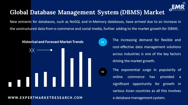 The global database management system (DBMS) market growth is further driven by the surge in digital data, the proliferation of IoT devices, and the growing reliance on big data analytics across industries. Organizations are working efficiently to manage, integrate, and secure vast volumes of structured and unstructured data generated from diverse sources. This demand has made robust DBMS solutions essential for supporting real-time analytics, ensuring regulatory compliance, and enabling agile business operations.