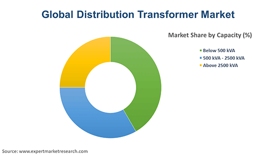 The different capacities of distribution transformers include below 500 kVA, 500 kVA - 2500 kVA and above 2500 kVA.