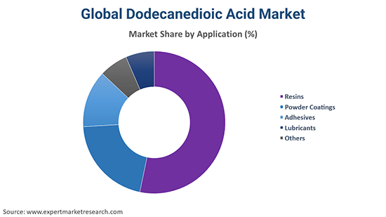 Dodecanedioic acid find their major application in resins, powder coatings, adhesives, and lubricants, among others.