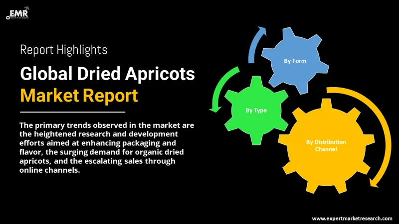 The key trends in the market include the growing research and development activities to improve packaging and enhance flavour, rising popularity of organic dried apricots, and increasing sales via online channels are the key trends in the market.
