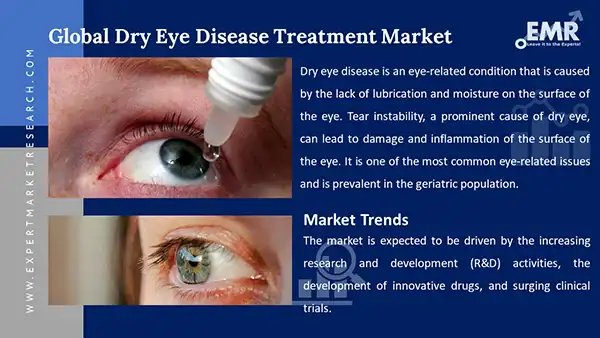 The market growth of dry eye disease treatment is being driven by the development of various innovative treatments. The increasing research and development (R&D) activities by the leading companies are leading to the development of drugs for temporary relief from the symptoms of dry eye for patients with critical conditions, which is expected to propel the market growth. Moreover, various clinical trials initiated are anticipated to further augment the growth of the dry eye disease treatment industry. As healthcare accessibility in low and middle-income countries is increasing robustly, the treatment for dry eye diseases is escalating, which is projected to positively impact the market growth. In addition, the increasing approval of novel drugs by various organisations such as the Food and Drug Organisation (FDA) in the United States is surging the availability of diverse treatments, which is projected to propel the market growth. The extensive development of various devices to stimulate tears is also projected to invigorate the industry growth in the forecast period.