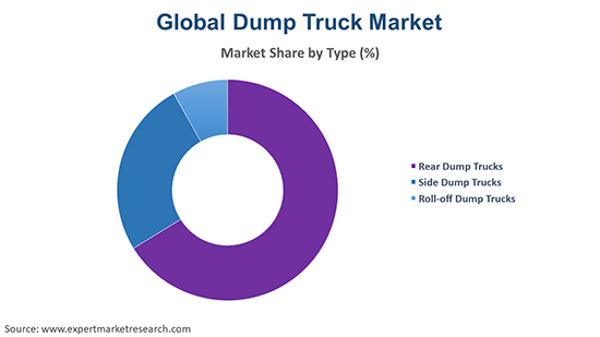 On the other hand, as per the dump truck market report, the side segment is expected to be the fastest-growing segment over the forecast period due to its safety features. These vehicle variants have a large load capacity and provide better stability while dumping or unloading. Also, these vehicles can quickly dump the load by using hydraulic rams.