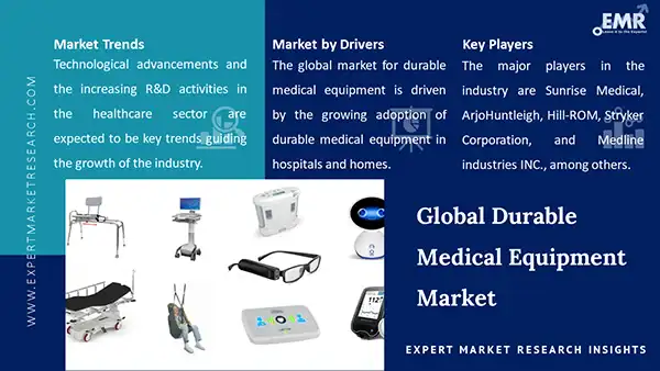The major drivers of the market include the growing end uses of durable medical equipment in the various industries, the increasing cases of accidents, the growing geriatric population, and the rising demand for durable medical equipment for children.