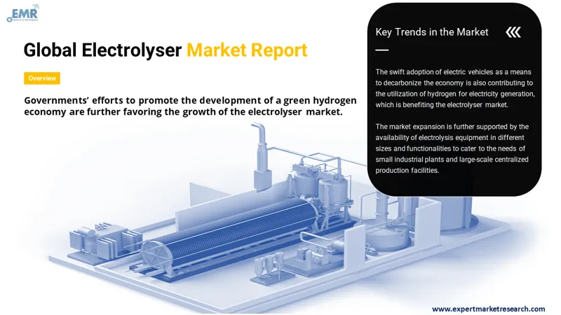 The rising energy consumption worldwide is resulting in the emerging need for clean energy sources like hydrogen, which, in turn, is increasing the use of hydrogen production methods like water electrolysis. There is a rising application of hydrogen produced from electrolysers in hydrogen fuel cells to generate electricity with zero emissions and reduce the dependency on fossil fuels. Additionally, the rapid adoption of electric vehicles to decarbonise the economy is resulting in the utilisation of hydrogen to generate electricity, thereby benefitting the market. The availability of different electrolysers of varied sizes and functions that can meet the needs of small industrial plants to large-scale centralised production facilities is contributing to the market expansion. The increasing government efforts to support the development of a green hydrogen economy are also favouring the electrolyser market growth. For instance, in September 2021, the Government of India decided to develop a production-linked incentive (PLI) scheme to bolster the indigenous manufacturing of electrolysers and meet the target of establishing 10 gigawatts of domestic manufacturing capacity for green hydrogen. Over the forecast period, the expanding research activities to develop improved electrolyser technology are expected to aid the market growth.