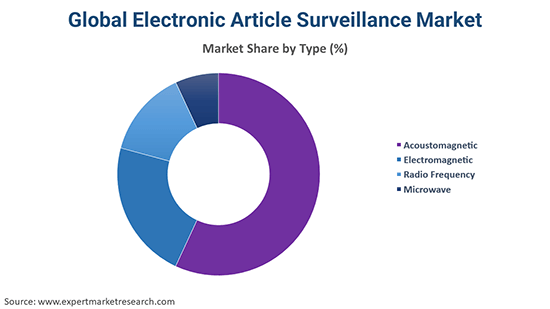 The significant types of electronic article surveillance in the market include acoustomagnetic, electromagnetic, radio frequency, and microwave.