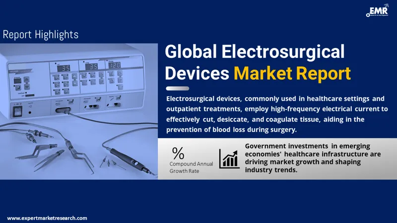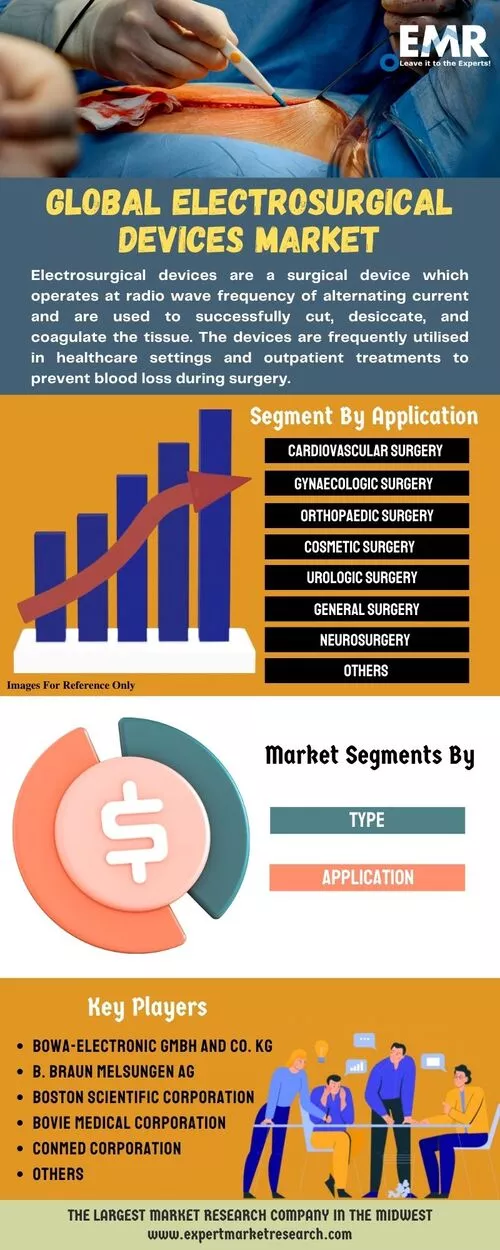 Electrosurgical devices are surgical devices that operate at high-frequency electrical current and are used to successfully cut, desiccate, and coagulate the tissue. The devices are frequently utilised in healthcare settings and outpatient treatments to prevent blood loss during surgery. It has a number of advantages, including the ability to produce precise incisions with minimal blood loss. Different types of surgical units utilise different sources of energy, such as radio frequency or high-frequency, molecular resonance, and ultrasound, and so these devices can also be called radiofrequency (RF) devices or high-frequency (HF) devices based on the energy source utilised.