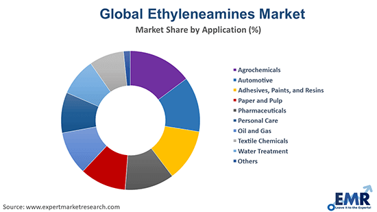 The significant applications of ethyleneamine are agrochemicals, automotive, adhesives, paints, and resins, paper and pulp, pharmaceuticals, personal care, oil and gas, textile chemicals, and water treatment, among others.