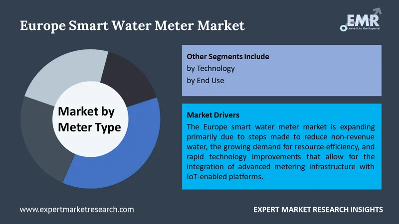 The major drivers of the Europe smart water meter market include the favourable policies of governments in the region encouraging the adoption of smart water meters, massive investments in developing smart city infrastructure, growing importance of analysing water usage, and soaring industrial reliance on water resources.