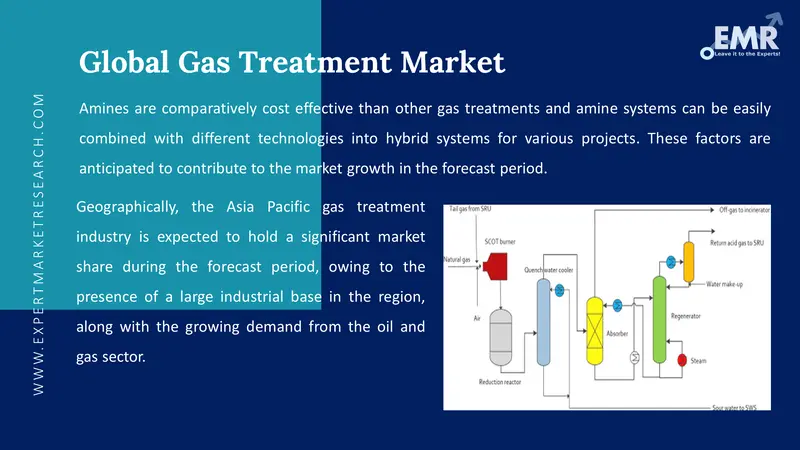 Geographically, the Asia Pacific gas treatment industry is expected to hold a significant market share during the forecast period, owing to the presence of a large industrial base in the region, along with the growing demand from the oil and gas sector. Moreover, the rapid industrialisation and urbanisation, increase in population, and availability of affordable raw material and low-cost labour in the region are the key factors anticipated to propel the growth of the gas treatment industry in the forecast period.