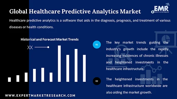 The rapidly increasing incidences of chronic illnesses worldwide, such as cardiovascular diseases, are leading to an increased demand for efficient healthcare facilities for timely diagnosis and effective treatment of diseases, which is propelling the healthcare predictive analytics industry. According to the WHO estimates, cardiovascular diseases are the leading cause of death globally, claiming more than 17.9 million lives every year. Cardiovascular diseases are illnesses of heart and blood vessels that are adversely affected by high-risk behaviours, such as unhealthy diet, physical inactivity, and substance abuse. Moreover, the heightened investments in the healthcare infrastructure worldwide are also aiding the market growth. For instance, according to Deloitte’s 2021 Global Healthcare Outlook report, the health spending is anticipated to rise at a 3.9% CAGR between 2020 to 2024, wherein the fastest growth is expected in the Asia Pacific region. These factors are predicted to drive the market growth in the coming years.