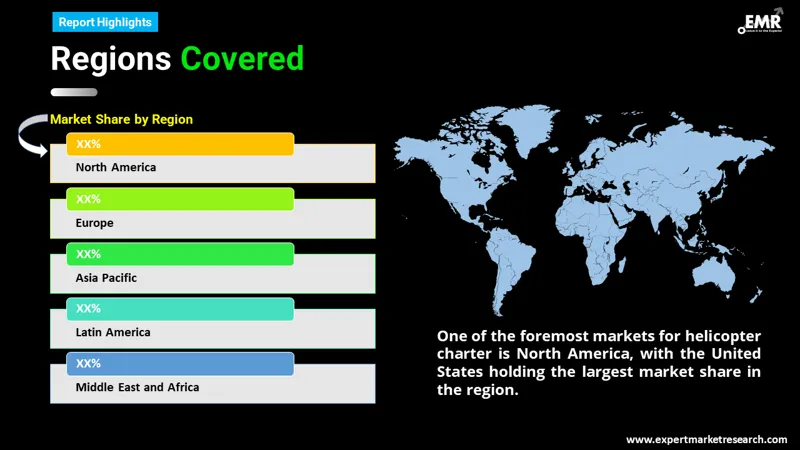 Key Insight: Regional helicopter charter market dynamics reflect how geography, economic structure and regulation intersect. North America leads the industry with a strong combination of increasing corporate travel, energy projects and established emergency services infrastructure. The European market growth is shaped by offshore wind expansion and dense cross border business travel. Asia Pacific is growing rapidly with tourism and resources projects spread across islands and remote interiors. Latin America and the Middle East and Africa contribute specialized demand around mining, oil, security and government support. Operators that allocate aircraft and crews flexibly across these regions can capture seasonal peaks and diversify risk better.
