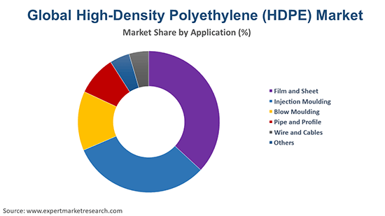 The blow moulding segment in high-density polyethylene (HDPE) market includes products such as bottles, containers, drums, and tanks that are formed by blowing air into a hollow plastic tube. The growth of this segment is fuelled by the rising demand for blow moulded HDPE in the packaging of liquids, such as milk, juices, water, detergents, etc. Consumer and regulatory pressure for sustainable packaging is boosting bio-based and recycled HDPE use in blow moulding. Companies like Braskem are producing bio-based HDPE bottles from sugarcane ethanol, offering a lower carbon footprint.