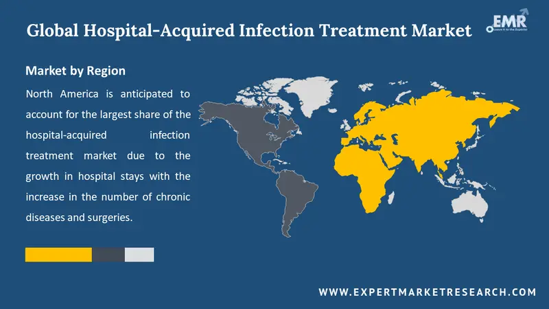 North America is anticipated to account for the largest share of the hospital-acquired infection treatment market due to the growth in hospital stays with the increase in the number of chronic diseases and surgeries. This can be attributed to the rising number of hospital admissions, that too for an extended period. Further, this will also increase the chances of hospital-acquired infection and will bolster the market development.