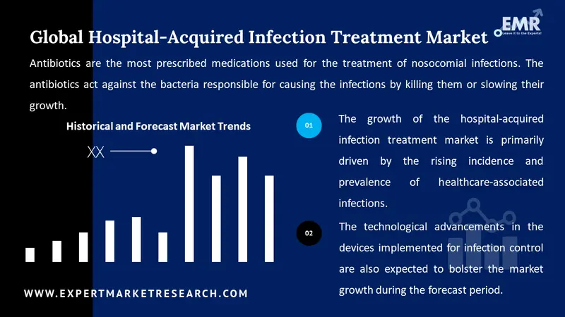 The growth of the hospital-acquired infection treatment market is primarily driven by the rising incidence and prevalence of healthcare-associated infections. This is further stimulated by the growing cases of chronic disorders and surgeries, which require prolonged hospital stays and thus will increase the risk of acquiring nosocomial infections. Additionally, the technological advancements in the devices implemented for infection control are also expected to bolster the market growth during the forecast period.