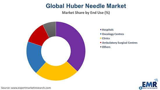 Based on the product type, the market is segmented into straight Huber needles and curved Huber needles, among others. Out of these, straight Huber needles cover a major market share and are widely used for various medical procedures, including chemotherapy, intravenous therapy, and blood product administration. The design of these needles ensures easy access to implanted ports. The increasing prevalence of cancer and the growing demand for chemotherapy are significantly boosting the demand for straight Huber needles. On the other hand, curved Huber needles allow a comfortable approach to access difficult-to-reach implanted ports.