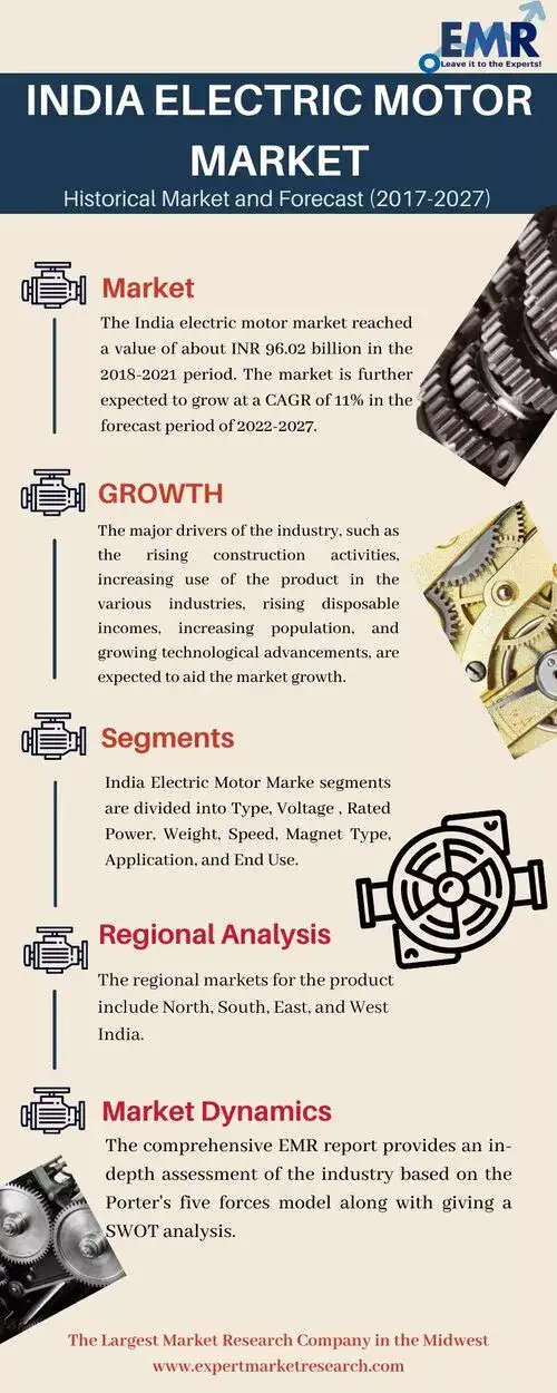 The rising use of electric motors in versatile end-use sectors, the growing population in tier-II and tier-III Indian cities, and the increasing manufacturing of electric motors in the country are the key trends guiding the market.