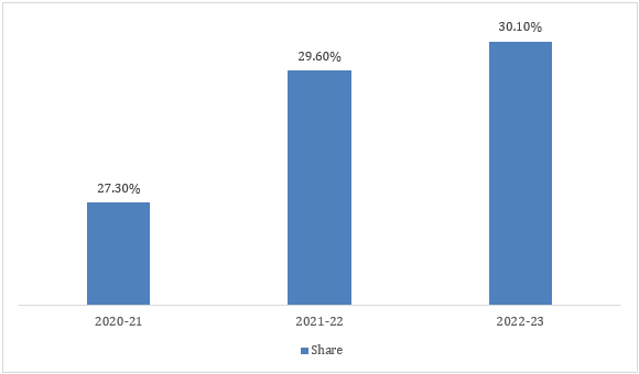 The Gross Value Added (GVA) by MSMEs in India’s GDP was 27.3% in 2020-21 and rose to 30.1% in 2022-23. Furthermore, Inkjet printers are popular in the commercial sector to help businesses grow by producing high-quality and personalised content. The rising adoption of inkjet printers aids the demand for ink cartridges. In 2024, India's office market expanded, with leasing activity across 7 cities, including Bengaluru, Chennai, and Delhi NCR, increasing by 22.6% y-o-y.