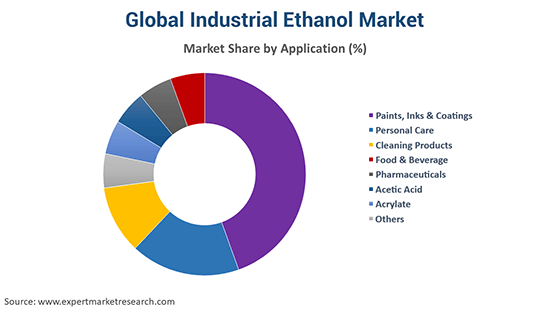 Paints, inks, and coatings, personal care, cleaning products, food and beverage, pharmaceuticals, acetic acid, and acrylate, among others, are the major applications of industrial ethanol in the market.