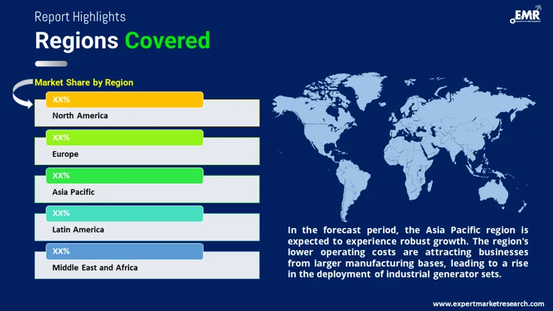 The Asia Pacific region is projected to grow at a healthy rate in the forecast period. Lower operating costs in this region is attracting businesses from larger manufacturing bases, allowing for more industrial generator sets to be deployed. Furthermore, the area is developing itself as a low-cost automotive production and export centre, which will accelerate the deployment of these devices. As per the industrial generator sets market analysis, the growing importance of reliable backup power solutions, combined with the financial and output losses associated with outages at manufacturing facilities, would benefit industry expansion. Furthermore, the recent implementation of relevant legislation favouring the revival of mining activities will provide additional impetus to the industry's development.