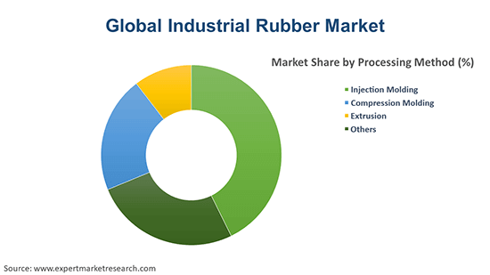 The major processing methods of industrial rubber in the market are injection moulding, compression moulding, and extrusion, among others.