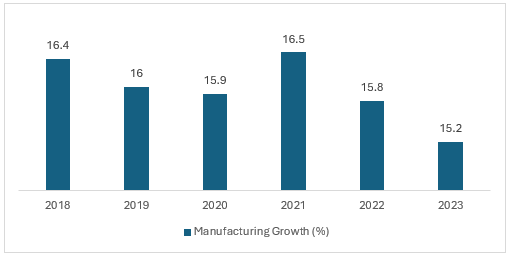 Figure: Global Manufacturing, Value Added (in % of GDP), 2018-2023