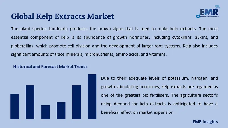 Due to their adequate levels of potassium, nitrogen, and growth-stimulating hormones, kelp extracts are regarded as one of the greatest biofertilizers. The use of kelp extracts in biofertilizers is a key trend in the kelp extracts market. The agriculture sector's rising demand for kelp extracts is anticipated to have a beneficial effect on market expansion.