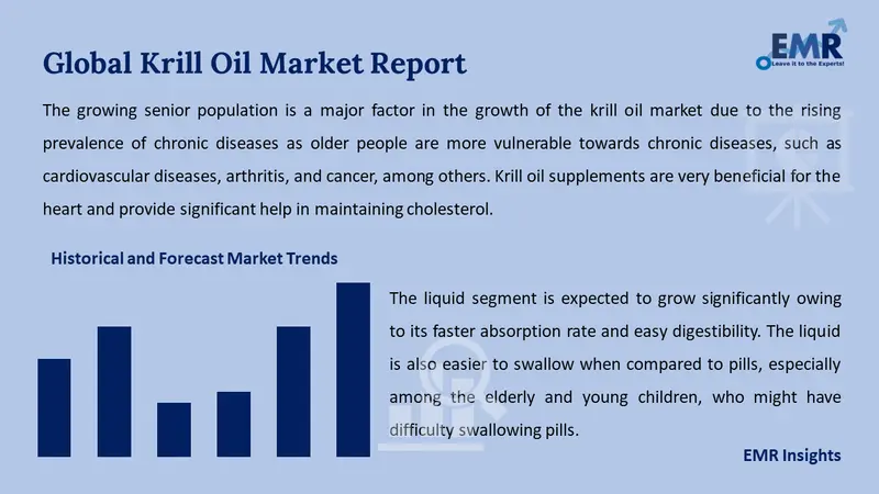 The demand for omega-3 fatty acids in functional foods is fueling the growth of the krill oil market. Consumers are becoming more knowledgeable about the benefits of omega-3s, including the support of heart health, cognitive function, and reduced inflammation. As awareness of these benefits grows, krill oil, with its high levels of omega-3 fatty acids and better absorption rate than fish oil, is coming into preference. It is entering food products in the form of fortified beverages, snacks, and supplements. This trend is complemented by a growing concern for natural and sustainable ingredient usage in food products as well, thereby propelling the krill oil demand.