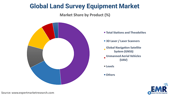 The market is categorised according to the product, which includes total stations and theodolites, 3d laser/laser scanners, global navigation satellite system (GNSS), unmanned aerial vehicles (UAV), levels, and others.