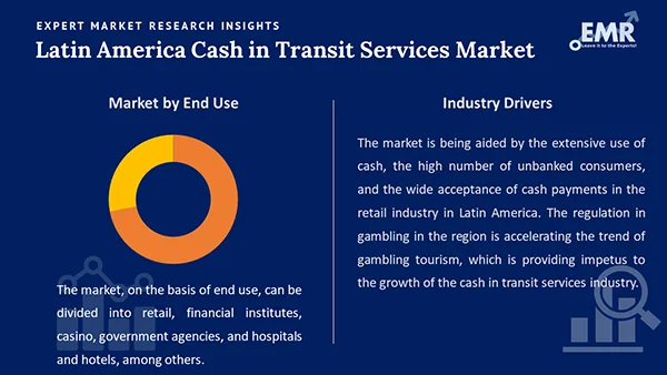 The extensive use of cash in the Latin American economy is increasing the demand for cash in transit, which is augmenting the market growth. Although alternatives such as credit cards, online banking, and mobile banking are available in the region, transactions through cash dominate in the region. This is increasing the requirement for secure transfer of cash, hence augmenting the market growth of cash in transit services. Moreover, the high numbers of unbanked consumers owing to socioeconomic constraints in the region is also increasing the reliance on physical currency, hence invigorating the industry growth. As the informal sector is one of the largest sectors in Latin America, the demand for cash in transit services is surging, which is providing further impetus to the market growth. The wide acceptance of cash in the retail sector in the region is increasing the demand for efficient cash in transit services to prevent thefts or robberies during the transfer of cash. The low-income levels and the high costs associated with digital transactions are increasing the use of cash in various end uses, therefore catalysing the industry growth. In addition, the lack of competition among payment service providers owing to limited competition in the region is decreasing the adoption of digital payment methods, which is further fuelling the market growth of cash in transit services due to the extensive acceptance of cash by retailers.