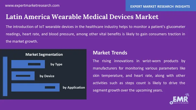 In the Latin America wearable medical devices market, rising investments, grants, and funding coupled with an increasing inclination toward wireless devices among consumers as well as healthcare providers are pushing forward the growth of the market. The introduction of IoT wearable devices in the healthcare sector helps to monitor a patient's glucometer readings, heart rate, and blood pressure, among other vital benefits. This further provides better health and safety management which is likely to increase the demand for wearable medical devices over the coming years. The increasing availability of wearable medical devices in the region, supported by the expansion of several key players and encouragement by the healthcare sector, is also anticipated to boost the market share over the forecast period.