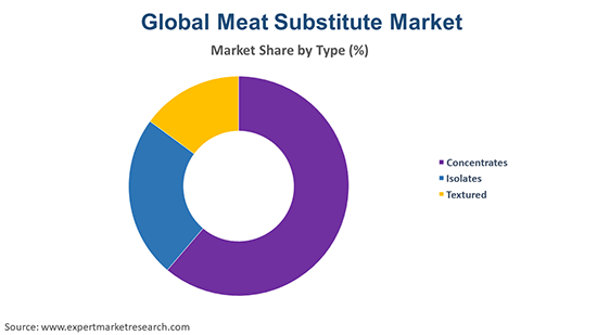 The significant types of meat substitute in the market are concentrates, isolates, and textured.