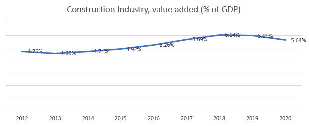 Figure: Construction Industry Value Added to GDP In Mexico, 2012-2022