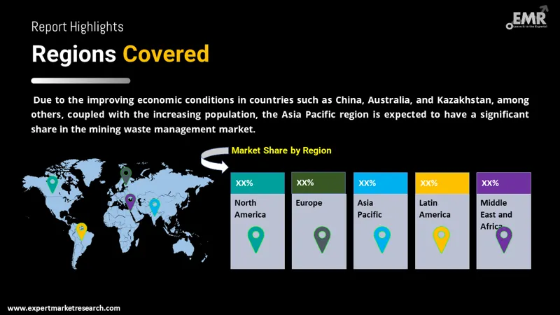 The Asia Pacific region is likely to be the leading region in the mining waste management market share on account of the growing economic conditions in countries like Kazakhstan, Australia, and China, among others along with the surging population in the region. Government support in the form of initiatives towards better waste management and rising concerns for the environment are driving the market growth across the region.