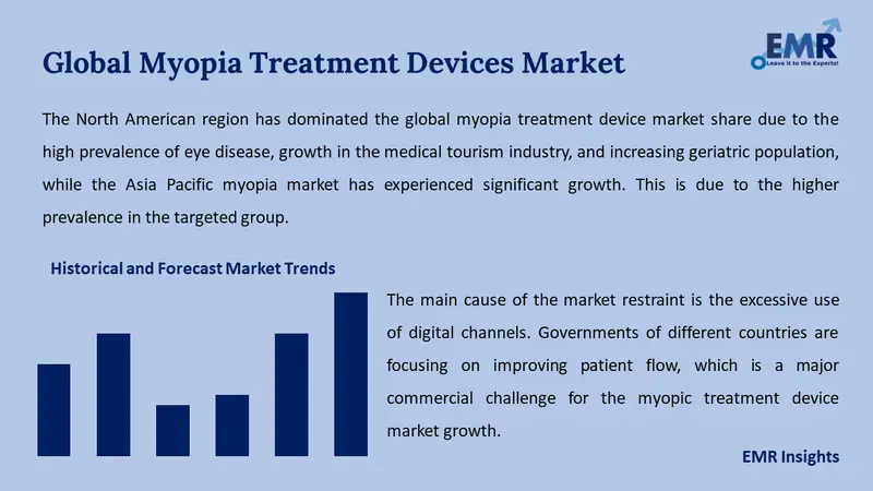 The increasing prevalence of myopia, particularly among children, and the growing importance of outdoor activities in slowing progression are key factors driving market growth. For instance, In May 2023 , HOYA Vision Care launched the MiYOSMART Sun lenses in Canada, expanding its global reach. These lenses, incorporating DIMS Technology, are designed to slow myopia progression while providing UV protection and encouraging outdoor activity. By integrating photochromic and polarised lenses, the product addresses myopia progression while promoting healthy lifestyle habits. HOYA’s expansion into international markets and the ongoing evidence supporting outdoor activities as a key factor in myopia management will fuel the growth of the global myopia treatment devices market over the forecast period.