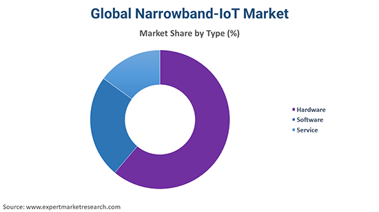 Hardware includes essential components like NB-IoT modules, sensors, and devices, which are critical for deploying IoT solutions across various industries. As NB-IoT is used for smart meters, sensors, and tracking devices, the demand for these hardware products is high. As per the narrowband-IoT market dynamics and trends, the initial deployment of NB-IoT networks requires significant investment in hardware infrastructure, such as base stations and network modules, which drives the share of hardware higher than software or services.