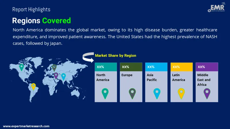 North America accounted for the largest share of the global market, almost 79.62%, in 2021. This can be attributed to the region's high disease burden, higher healthcare expenditure, improved patient awareness. The United States had the greatest prevalence of NASH cases, followed by Japan.
