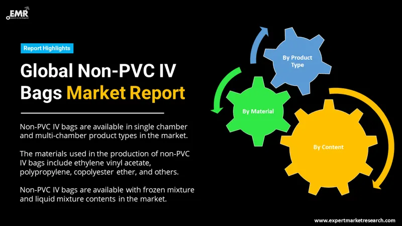 Non-PVC IV bags are intravenous bags that are produced without the use of polyvinyl chloride (PVC). These bags are primarily utilized for parenteral nutrition and are also commonly used for chemotherapy. With the arrival of several varieties of PVC substitutes like ethylene vinyl acetate and polypropylene, the widely used PVC packaging has a high likelihood of being replaced with non-PVC alternatives.
